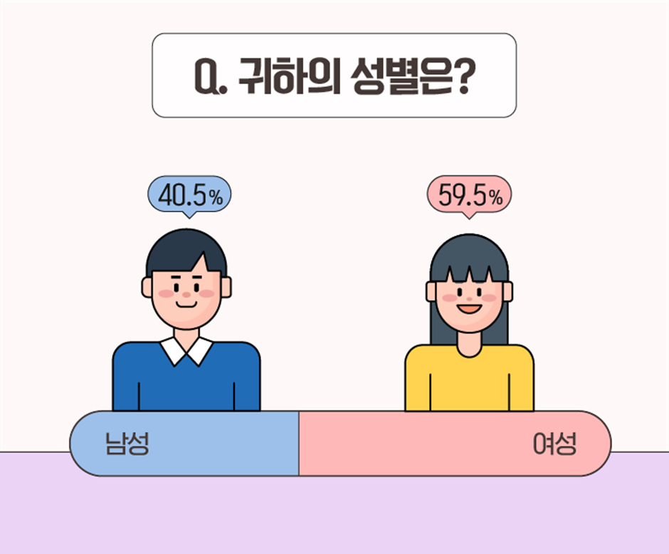 설문 참여자의 성비는 ‘남성’이 40.5%, ‘여성’이 59.5%로 여성 참여자의 비율이 다소 높은 모습입니다.