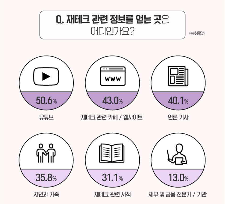 이어서 재테크 관련 정보를 얻는 곳에 대해 확인해 봤습니다. ‘유튜브’가 50.6%로 가장 많이 꼽혔는데요. 다양한 정보가 유통되는 플랫폼답게 많은 밀레니얼 세대가 ‘유튜브’를 통해 정보를 습득하고 있음을 알 수 있었습니다. 아울러 ‘재테크 관련 카페 / 웹사이트(43%)’, ‘언론 기사(40.1%)’도 많은 선택을 받았습니다. 온라인 상에서 활발한 교류로 유용한 정보를 얻는 사람들이 많아지고 있는 것 같네요. :) ‘지인과 가족(35.8%)’, ‘재테크 관련 서적(31.1%)’, ‘재무 및 금융 전문가/기관(13%)’에서 정보를 얻는다는 응답이 뒤를 이었습니다.