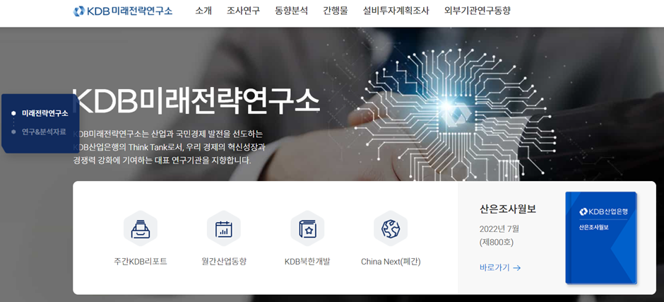 다음으로는 KDB산업은행 산하 경제 연구소 사이트인 ‘KDB미래전략연구소’에 대해 알아보겠습니다. 산업은행의 역할은 기업들을 대상으로 대출을 해주거나 투자를 하는 것이기 때문에, 그만큼 산업의 동향을 면밀하게 분석하는 것이 필수적입니다. KDB미래전략연구소는 금융을 포함해 경제, 산업, 북한 동향 등에 관한 최신 정보를 제공하고 있습니다.