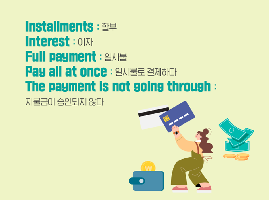 신용카드로 결제할 때 간편한 점은 바로 큰 금액은 여러 번에 나누어 결제할 수 있다는 점입니다. 그 자리에서 전액을 지불해야 하는 현금결제와는 달리 신용카드는 계약을 맺어 다달이 이체가 가능하죠. 바로 ‘Installments(할부)’를 사용한 결제 방법입니다. 큰 금액을 내게 될 때 신용카드를 내면 점원에게 “How many monthly installments would you like to pay? (몇 개월 할부로 해드릴까요?)”라는 질문을 듣기도 합니다. 큰 금액을 결제할 때는 나눠 내는 게 부담이 덜 되기 때문이겠지만 ‘Interest(이자)’가 붙기 때문에 꺼려지기도 하죠. 이런 경우를 위해 ‘Interest’가 붙지 않는 할부 결제 방법도 있습니다. ‘Interest-free installments(무이자할부)’ 또한 할부 결제 시 자주 듣게 되는 표현이니 꼭 기억해두세요. 여기서 잠깐, 할부는 여러 번 나눠서 지불하는 방식이기 때문에 복수형 명사를 사용한다는 점 챙겨가세요!