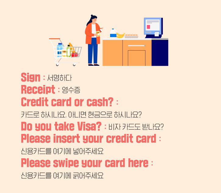 신용카드로 5만 원 이상 결제할 때 꼭 해야 하는 게 있죠. 바로 ‘Sign(서명하다)’입니다. 하지만 신용카드 뒷면에도 ‘Sign’할 수 있는 칸이 있다는 거, 알고 계셨나요? 신용카드를 분실했을 때 반드시 필요하니 잊지 말고 꼭 ‘Sign’해두시기 바랍니다. 그리고 결제를 하고 나면 받는 게 있죠. 바로 ‘Receipt(영수증)’입니다. 최근에는 ‘Receipt’가 필요 없는지 물어보고 가게에서 버려 주기도 하죠. 또한, 따로 종이 영수증이 발급되지 않고 온라인 영수증으로 대체되는 곳도 있습니다.