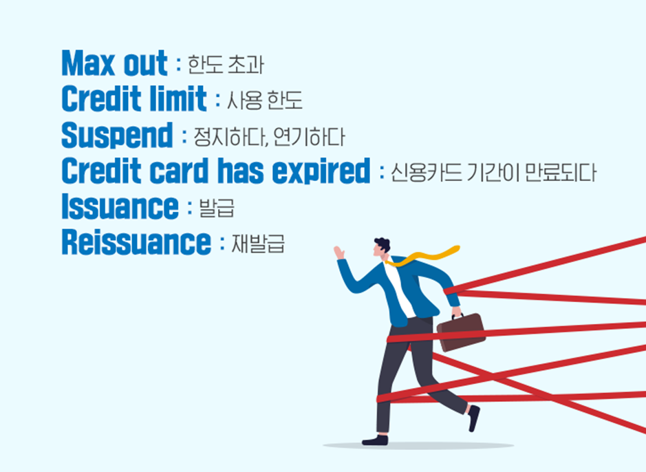 그 밖에도 신용카드가 ‘Suspend(정지하다)’되어 결제에 실패하는 경우도 있죠. ‘Suspend’는 ‘기간을 늘리다’라는 뜻으로도 많이 활용되는 단어인데요. 신용카드와 함께 사용할 때에는 주로 ‘정지하다’라는 의미로 사용된다는 것을 꼭 기억해두세요. 신용카드를 잃어버려 정지를 요청해야 할 때는 “Could you suspend my credit card? (제 신용카드를 정지해주시겠어요?)”라는 표현을 사용해볼 수 있습니다.