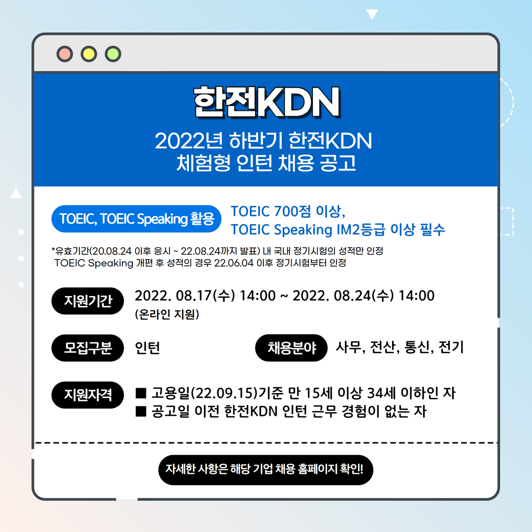 | 한전KDN | 인턴 | 2022년 하반기 한전KDN 체험형 청년 인턴 채용 공고 | 8.24(수) 14:00 | TOEIC 700점 이상 필수, TOEIC Speaking IM2 이상 필수 |