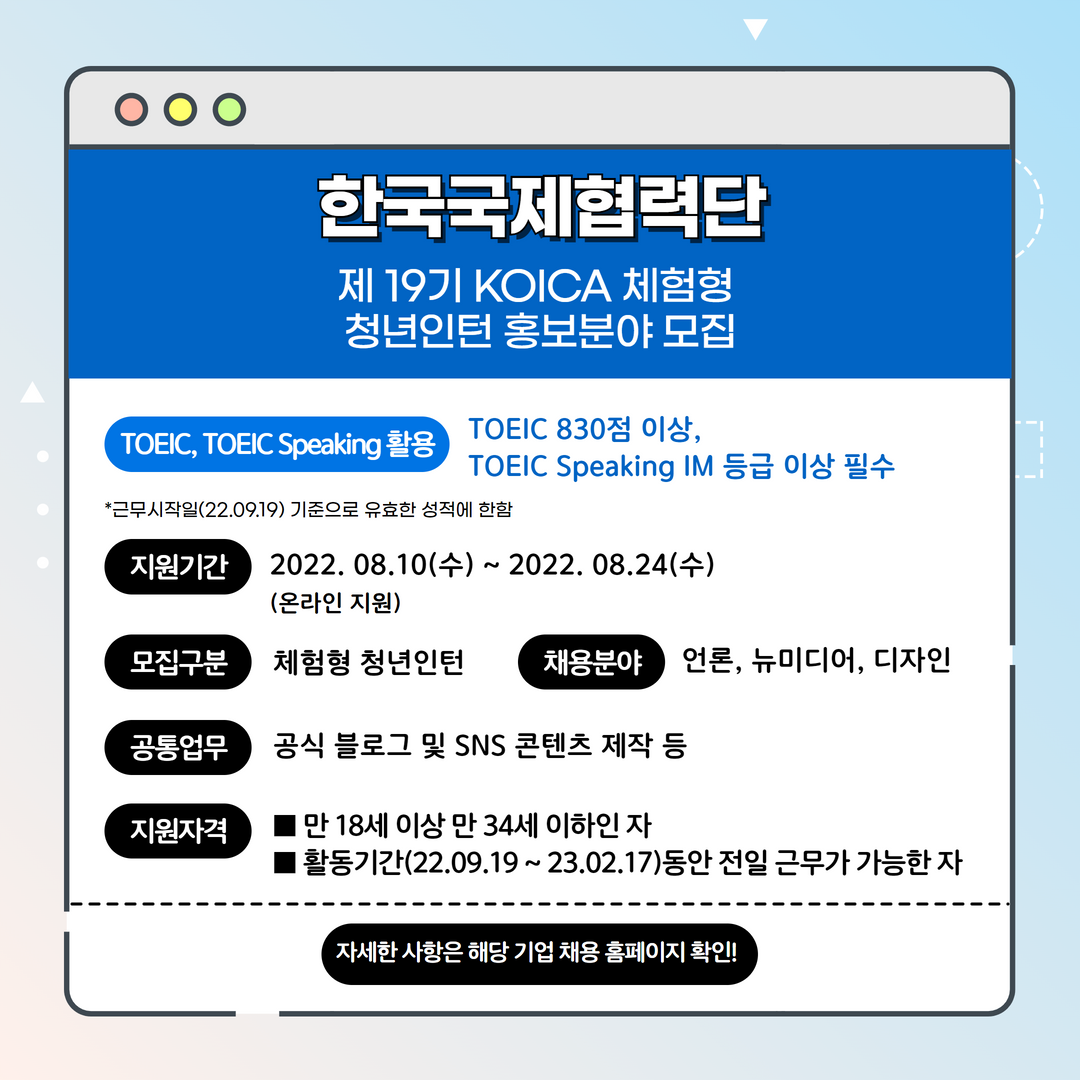 | 한국국제협력단 | 인턴 | 제 19기 KOICA 체험형 청년인턴 홍보분야 모집 | 8.24(수) 15:00 | TOEIC 830점 이상 필수, TOEIC Speaking IM 이상 필수 |