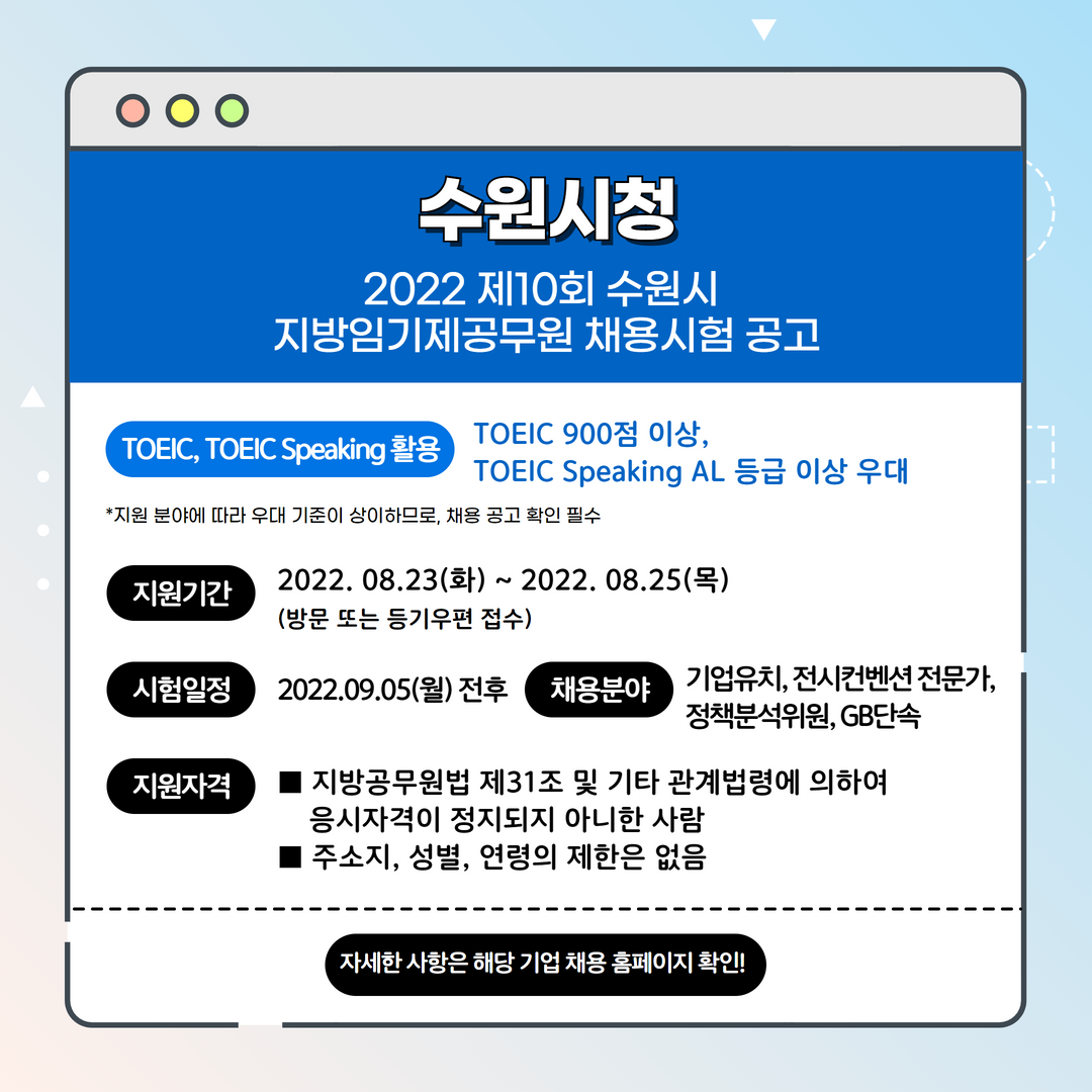 | 수원시청 | 경력 | 2022년 제10회 수원시 지방임기제공무원 채용시험 공고 | 8.25(목) 18:00 | TOEIC 900점 이상 우대, TOEIC Speaking AL 이상 우대 |