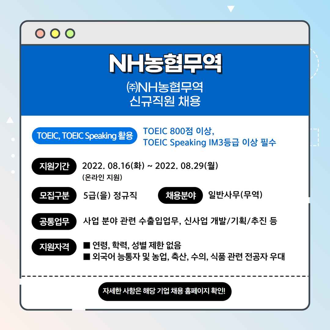 | NH농협무역 | 신입 | 신규직원 채용 | 8.29(월) 18:00 | TOEIC 800점 이상 필수, TOEIC Speaking IM3 이상 필수 |