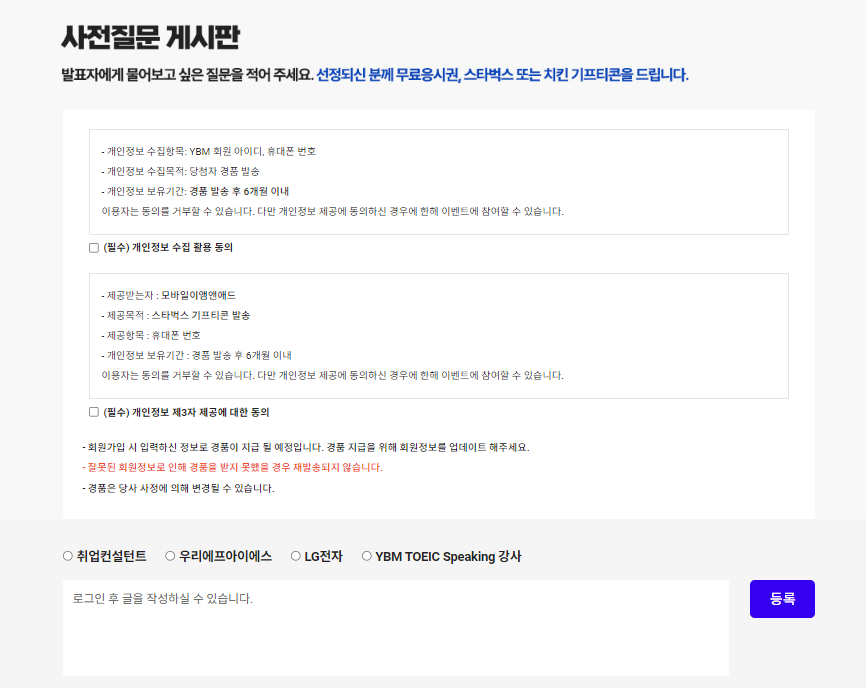 추첨 경품 역시 YBM 회원 아이디에 등록된 정보로 전달되니, 행사 전 YBM 회원 가입 및 회원 정보 업데이트를 확인하시기 바랍니다!