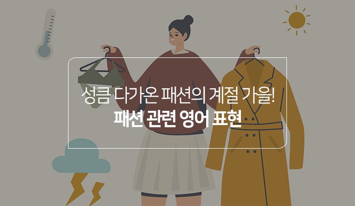 무더운 8월도 지나가고 가을의 초입이 눈앞에 바짝 다가왔습니다. 아직 날은 덥지만 더위가 그친다는 처서가 지나 불볕더위도 풀이 꺾일 때가 되었죠. 바야흐로 하늘이 높아지는 천고마비의 계절, 가을에는 날씨에 크게 구애받지 않고 다양한 패션 아이템을 소화할 수 있다는 장점이 있는데요. 가을을 상징하는 트렌치코트부터 카디건, 맨투맨 등 옷 입는 즐거움이 있는 시기죠. 날씨가 좋아 나들이를 나가고 싶은 마음까지 마구 부풀어 오릅니다. <토익스토리> 가족 여러분, 한껏 차려 입고 가을 나들이 나갈 준비되셨나요? 다양한 패션 관련 영어 표현과 함께 패션의 계절 가을을 맞이해봐요. :)