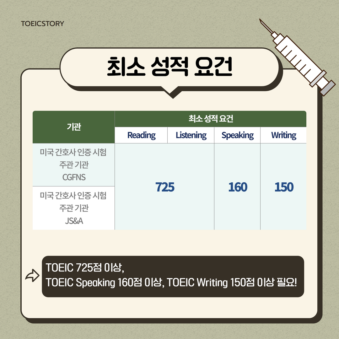 CGFNS, JS&A 두 기관 모두 요구하는 최소 성적이 동일한데요. 토익(Listening+Reading) 725점 이상, 토익스피킹 160점 이상, 토익라이팅 150점 이상의 성적이 필요합니다. 영어의 4Skills(Listening, Reading, Speaking, Writing) 성적을 모두 충족하여야 한다는 점 잊지 마세요.