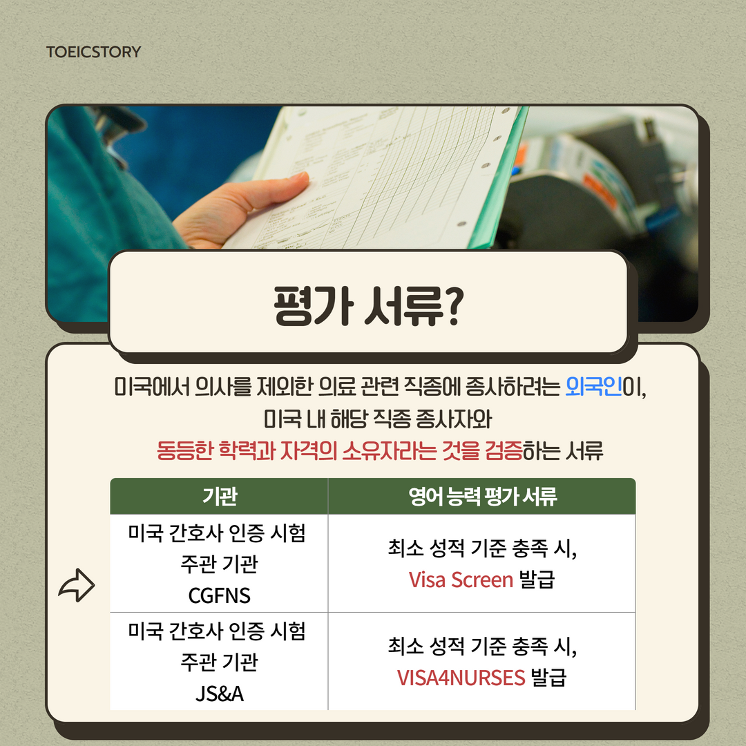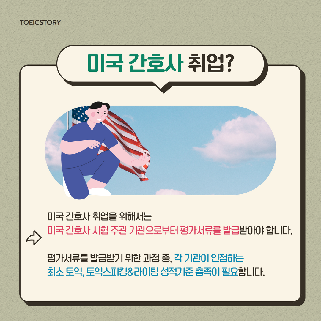 미국 간호사 취업이민 시험에 토익, 토익스피킹, 토익라이팅이 도입됐다는 사실, 알고 계셨나요? 공신력 있는 시험으로 다방면으로 활용되고 있는 토익과 토익스피킹&라이팅! <토익스토리>가 미국 간호사 및 의료인 인증 시험과 관련된 소식을 전해드립니다.