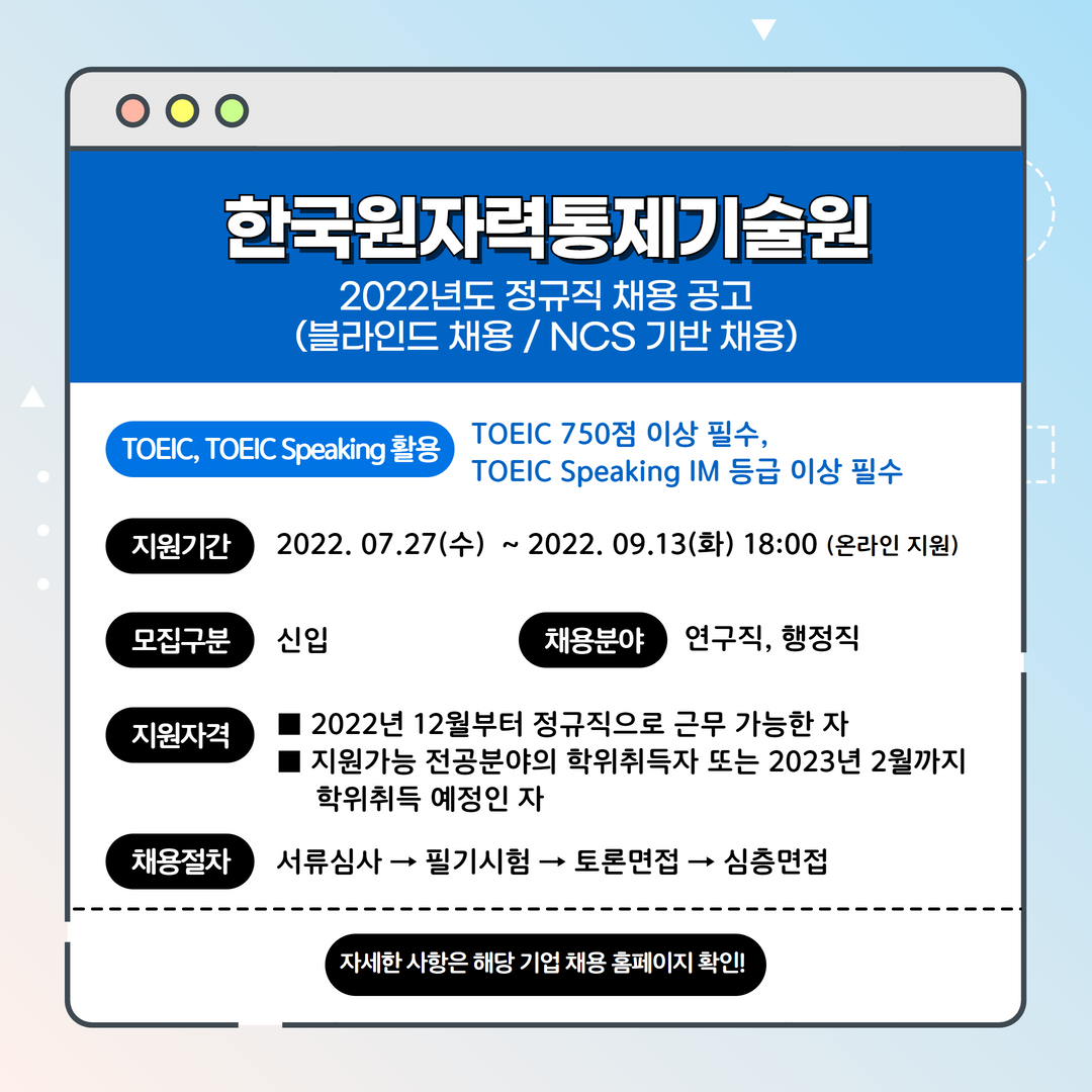 2022년 9월 13일(화) 18시까지 한국원자력통제기술원(KINAC) 채용 홈페이지를 통해 온라인 접수할 수 있습니다. 자세한 사항은 공고를 확인하시기 바랍니다.