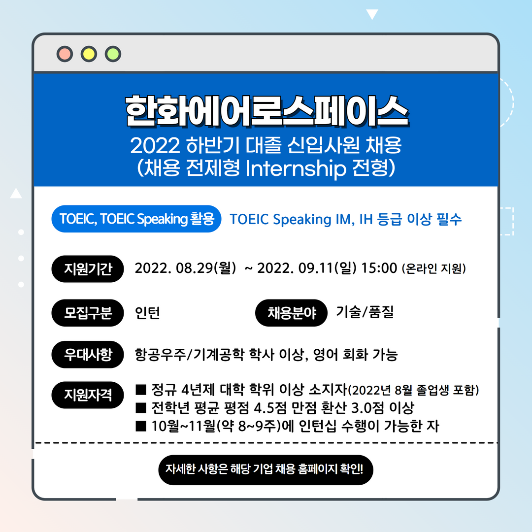 | 한화에어로스페이스 | 인턴 | 2022 하반기 대졸 신입사원 채용 (채용 전제형 인턴십) | 9.11(일) 15:00 | TOEIC Speaking IM, IH 이상 필수 |