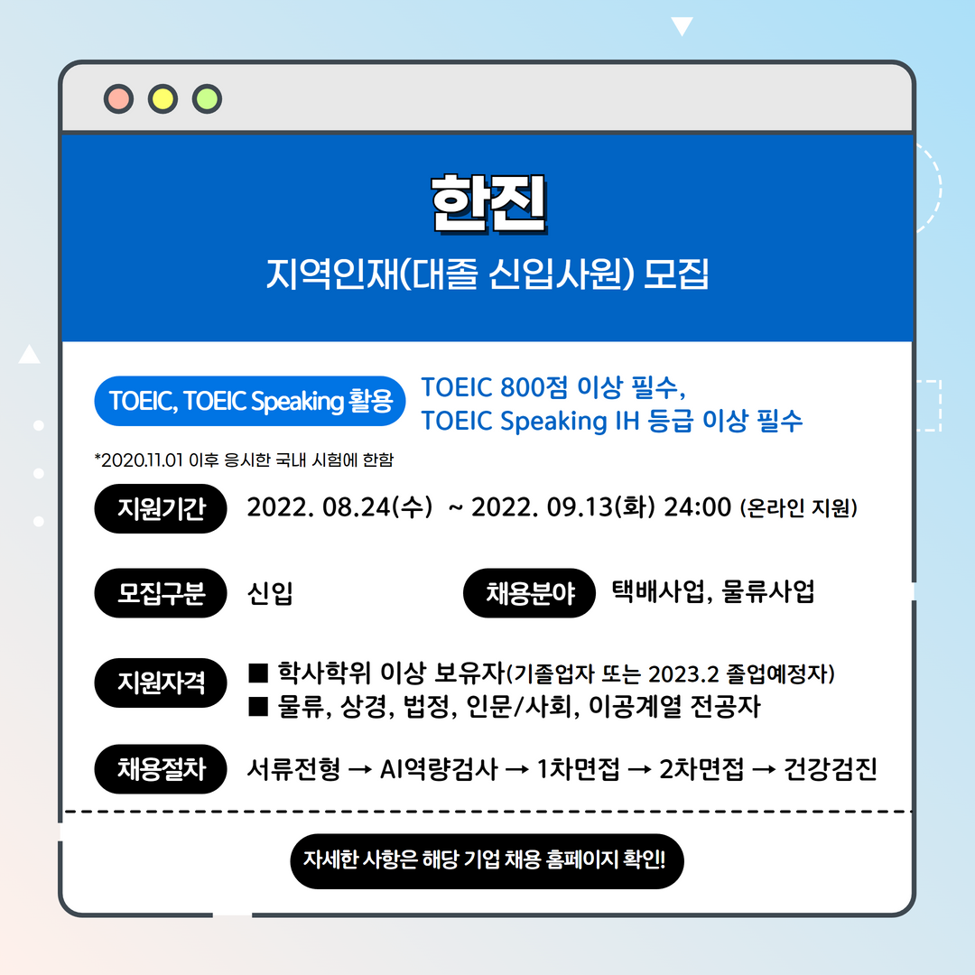| 한진 | 신입 | 지역인재 (대졸 신입사원) 모집 | 9.13(화) 24:00 | TOEIC 800점 이상 필수, TOEIC Speaking IH 이상 필수 |