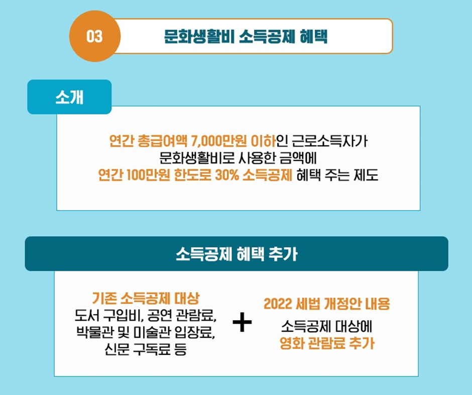 이러한 부담을 덜기 위해 내년부터는 식대와 함께 문화생활비 소득공제 혜택이 추가될 예정입니다. 문화비 소득공제는 연간 총 급여액 7,000만원 이하인 근로소득자가 문화생활비로 사용한 금액에 연간 100만원 한도로 30%의 소득공제 혜택을 주는 제도를 말하는데요. 기존의 소득공제 대상으로는 도서 구입비, 공연 관람료, 박물관 및 미술관 입장료, 신문 구독료 등이 있었습니다. 여기에 추가로 영화 관람료도 포함된다고 하니 앞으로 극장에서 영화도 부담 없이 즐길 수 있겠네요! 단, 문화비 소득공제 범위에 해당하더라도 실제 소득공제 혜택을 받기 위해서는 문화체육관광부로부터 문화비 소득공제 제공 사업자로 확정된 곳에서 구매해야 한다는 점 확인하시기 바랍니다! :)
