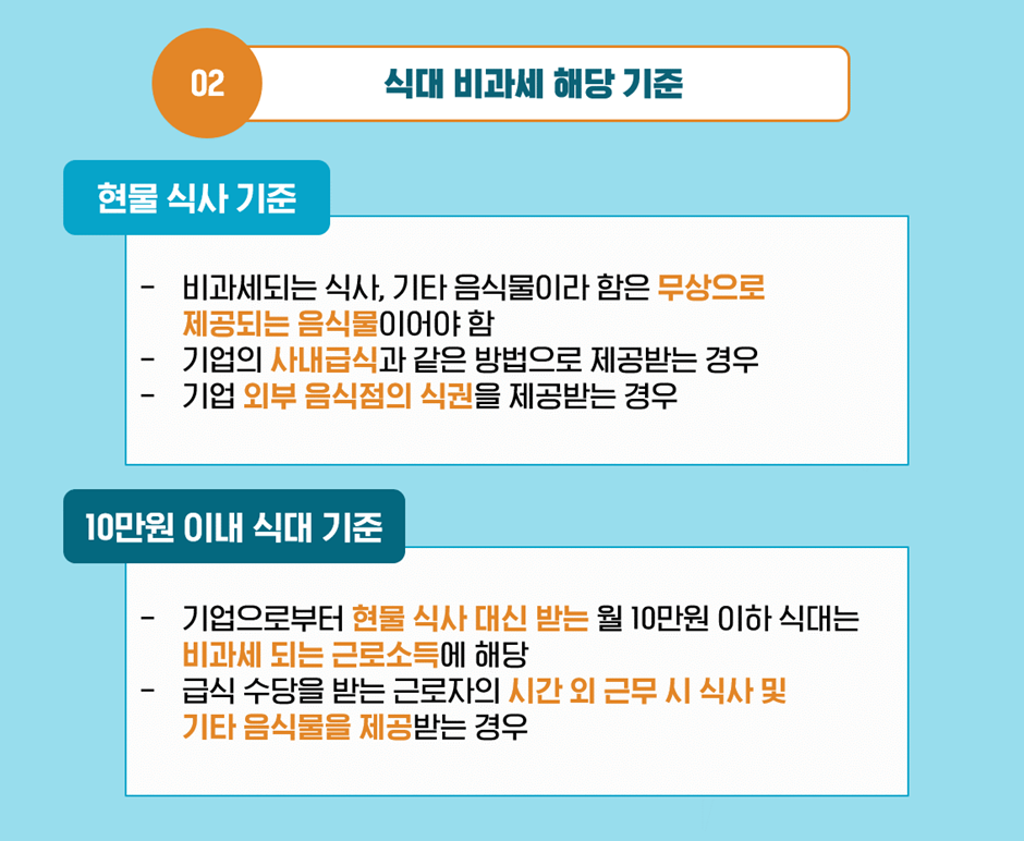 근로자가 회사로부터 현물 식사 또는 금전으로 식사대를 받을 경우는 비과세가 되는데요. 이러한 경우에는 정해진 기준에 따라 지급해야만 비과세 적용이 됩니다. 현물로 식사를 제공하는 경우, 사용자가 무상으로 제공하는 음식물이어야 하죠. 즉 사내급식과 같은 방법은 비과세에 해당됩니다. 뿐만 아니라 회사가 기업 외부의 업체와 식사 공급 계약을 체결하고 식권으로 제공하는 식사의 경우에도 비과세로 적용됩니다. 다만, 통상적으로 급여에 포함되지 않고 음식물의 제공 여부로 급여에 차등이 없어야 하며, 사용자가 추가 부담하여 제공해야 합니다. 또한, 현금으로 환급할 수 있는 식권 혹은 임직원이 인근 식당에 장부를 비치하여 외상으로 식사하는 경우 등은 비과세되는 식대가 아니라는 점도 챙겨가세요!