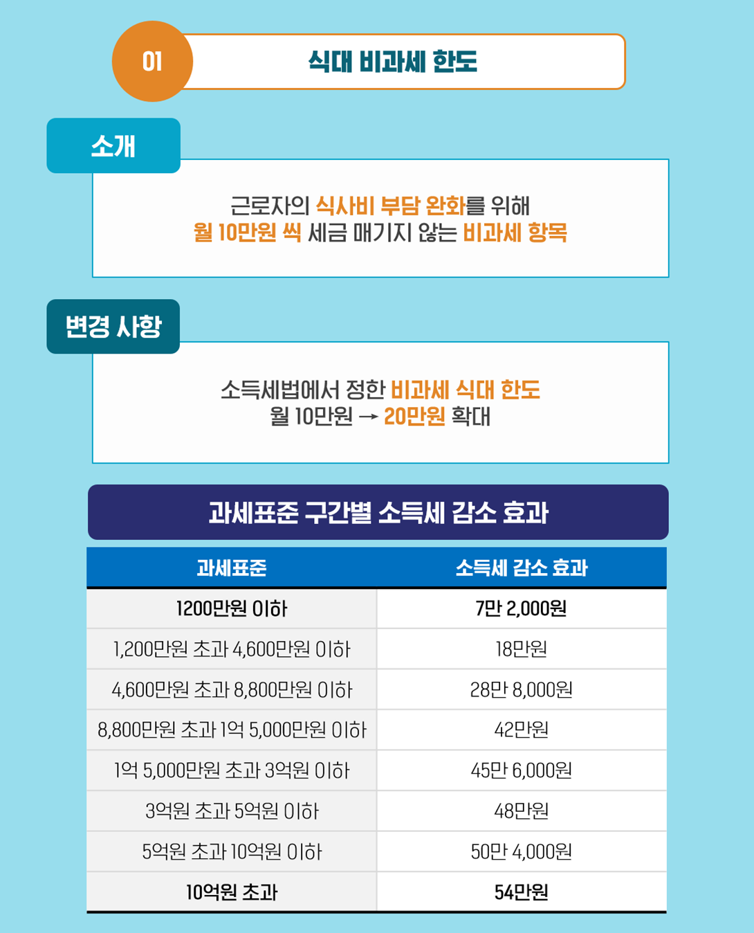 A1. 내년부터 식대 비과세 한도가 기존 10만원에서 20만원으로 확대됩니다.