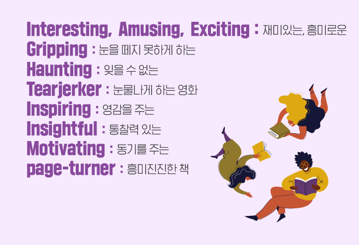 우리말 중 ‘눈물을 짜내는 이야기’라는 의미로 사용되는 ‘신파극’이라는 표현이 있죠. 영어에도 이와 비슷한 ‘Tearjerker’라는 표현이 있습니다. 영화나 연극에 대해 이야기할 때 주로 쓰이지만 슬픈 로맨스 소설처럼 눈물을 흘리게 만드는 책을 읽을 때에도 사용해 볼 수 있겠죠. 이 밖에도 다양한 장르에서 활용할 수 있는 표현들이 있는데요. 자기계발서를 읽으면서 ‘Inspiring(영감을 주는)’, ‘Insightful(통찰력 있는)’ 그리고 ‘Motivating(동기를 주는)’ 이라는 표현을 사용해 볼 수 있습니다. :)