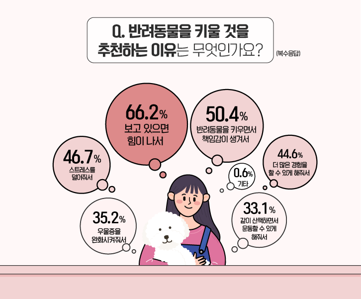 반려동물을 추천하는 데엔 어떤 이유가 있었을까요? ‘보고 있으면 힘이 나서(66.2%)’, ‘반려동물을 키우면서 책임감이 생겨서(50.4%)’, ‘스트레스를 덜어줘서(46.7%)’로 모두 심리적인 부분에서 장점을 느끼고 있었습니다. 다음은 심리적인 것과 동시에 생활패턴에서 느낄 수 있는 ‘더 많은 경험을 할 수 있게 해줘서’가 44.6%를 기록했는데요. 보통 가족들에게 느낄 수 있는 감정과 영향들을 반려동물에게도 동일하게 느낀다고 볼 수 있습니다.
