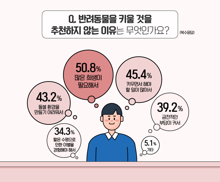 반대로 반려동물을 추천하지 않는 이유는 ‘많은 희생이 필요해서’라는 응답이 50.8%로 높은 비율을 차지했습니다. 생활적인 면에서 부담이 되는 ‘키우면서 해야 할 일이 많아서(45.4%)’, ‘돌볼 환경을 만들기 어려워서(43.2%)’의 이유도 높은 응답을 보였죠. 앞서 반려동물을 키우면 금전적인 지출이 불가피하게 발생되는 것을 확인했는데요. ‘금전적인 부담이 커서’ 추천하지 않는다는 응답도 39.2%를 기록했습니다. 그 외 반려동물의 ‘짧은 수명으로 인한 이별을 경험해야 해서’라는 이유도 34.3%로 나타났는데요. 반려동물과 함께 살기 위해서는 많은 부분들을 신중하게 고려해 결정하는 것이 필요할 것 같습니다.