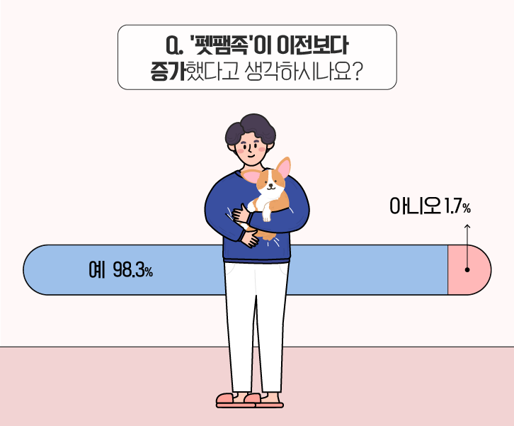 최근 증가하고 있는 ‘펫팸족’에 대한 생각도 알아봤습니다. 이전보다 펫팸족이 증가했다고 생각하는 응답자가 98.3%로 압도적인 비율을 차지했습니다.