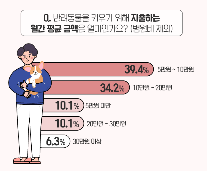 소중한 가족이 생긴 만큼 생활에 필요한 물건이 필요해 금전적으로도 지출이 발생하는데요. 반려동물을 키우는데 월평균 ‘5만원~10만원’을 지출한다는 응답자가 39.4%, ‘10만원~20만원’을 지출하는 응답자가 34.2%로 나타났습니다. ‘5만원 미만’과 ‘20만원~30만원’은 10.1%로 동일한 비율을 기록했는데요. 대부분의 ‘펫팸족’들은 월평균 10만원 정도의 비용을 반려동물을 위해 소비한다고 볼 수 있겠습니다!