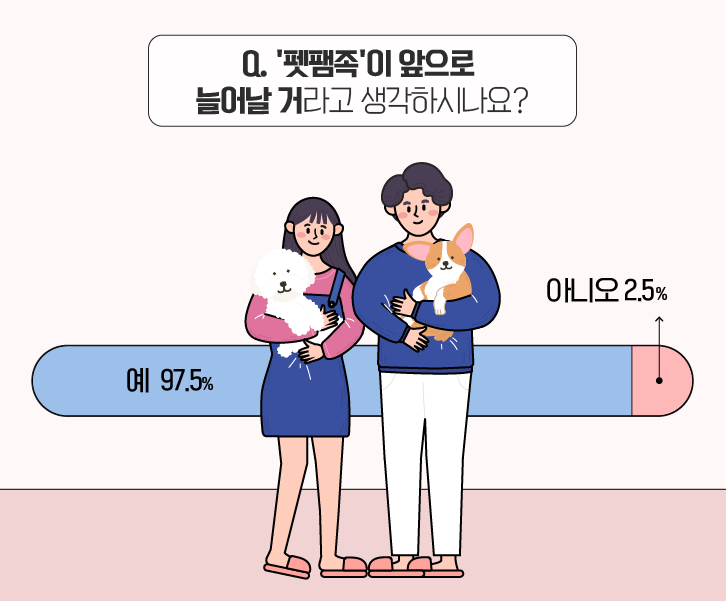 마지막으로 앞으로도 ‘펫팸족’이 지속적으로 증가할지에 대해 의견을 물었는데요. 무려 97.5%가 ‘펫팸족’ 증가에 대한 긍정적인 전망을 예상하고 있는 것으로 나타났습니다! 요즘 일상에서 반려동물과 산책하거나 음식점을 방문하는 모습, 많은 기업에서 반려동물 관련 용품과 서비스를 출시하는 모습 등을 쉽게 볼 수 있는데요. 이런 사회적 흐름이 자연스럽게 반영되어 나타난 결과라고 할 수 있을 것 같습니다.