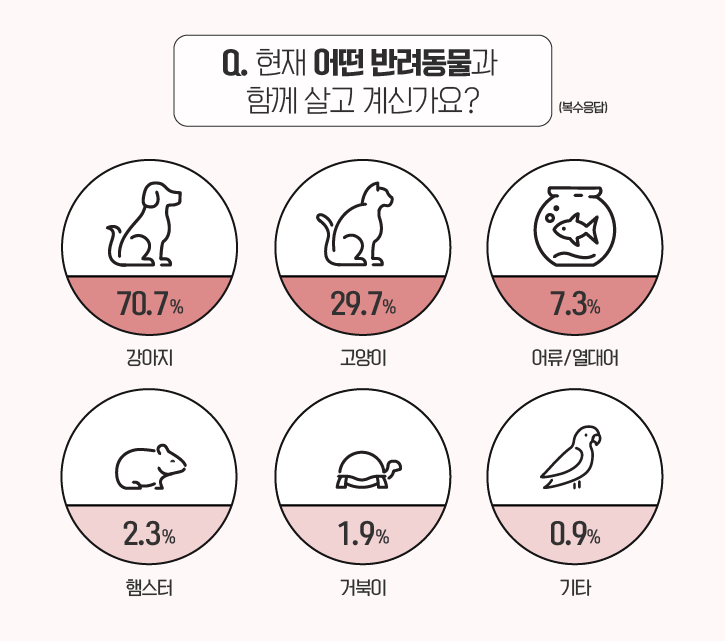 다음은 현재 어떤 반려동물과 함께 살고 있는지 알아봤습니다. 반려동물 중 강아지와 함께 살고 있는 응답자가 무려 70.7%라는 높은 비율을 기록했으며, 고양이는 29.7%로 2위를 기록했는데요. 다음으로는 ‘어류/열대어(7.3%)’와 ‘햄스터(2.3%)’, ‘거북이(1.9%)가 뒤를 이었고, ‘기타(0.9%)’는 토끼, 앵무새 등으로 다양한 반려동물을 키우는 분들도 있네요.