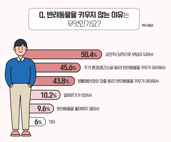 한편 반려동물을 키우지 않는 분들께는 그 이유를 질문 드려봤는데요. 응답자 상당수가 ‘금전적/심적으로 부담이 되어서(50.4%)’라고 응답하며, 반려동물이 심적으로 안정감을 줄 순 있지만 반대로 부담으로 느껴질 수도 있다는 것을 확인할 수 있었습니다. 또한 ‘주거 환경이 반려동물을 키우기 어려워서(45.6%)’와 ‘생활패턴이 반려동물을 키우기 어려워서(43.8%)’의 응답도 높은 비율을 차지했는데요. 가족으로서 함께 생활하기 위해 필요한 산책, 밥 챙겨주기, 층간 소음 등 여러모로 고려해야 할 부분이 많기 때문인 것 같습니다. 이외의 응답에는 ‘알레르기가 있어서(10.2%)’, ‘반려동물을 좋아하지 않아서(9.6%)’등이 있었습니다.