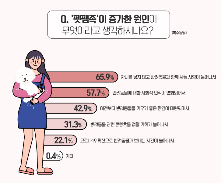 이어 ‘펫팸족’이 증가한 원인에 대해서도 질문을 드려봤는데요. ‘자녀를 낳지 않고 반려동물과 함께 사는 사람이 늘어나서(65.9%)’와 ‘반려동물에 대한 사회적 인식이 변화되어서(57.7%)’라는 답변이 상위권을 기록했습니다. 펫 카페, 펫 유치원 등 ‘이전보다 반려동물을 키우기 좋은 환경이 마련되어서’라는 응답도 42.9%로 높은 비율을 차지했고, ‘반려동물 관련 콘텐츠를 접할 기회가 늘어나서’라는 응답도 31.3%를 기록했는데요. 그 외 ‘코로나19 확신으로 반려동물과 보내는 시간이 늘어나서(22.1%)’라는 답변 등 다양한 생각을 확인할 수 있었답니다. :)