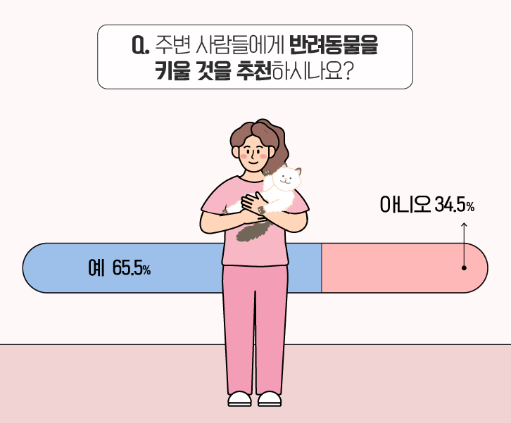 다시 설문 참여자에게 공통으로 질문한 문항으로 돌아와 보겠습니다. 주변 사람들에게 반려동물을 키울 것을 추천하는지를 조사해 봤는데요. 65.5%에 달하는 인원이 ‘추천한다’라고 응답했습니다.