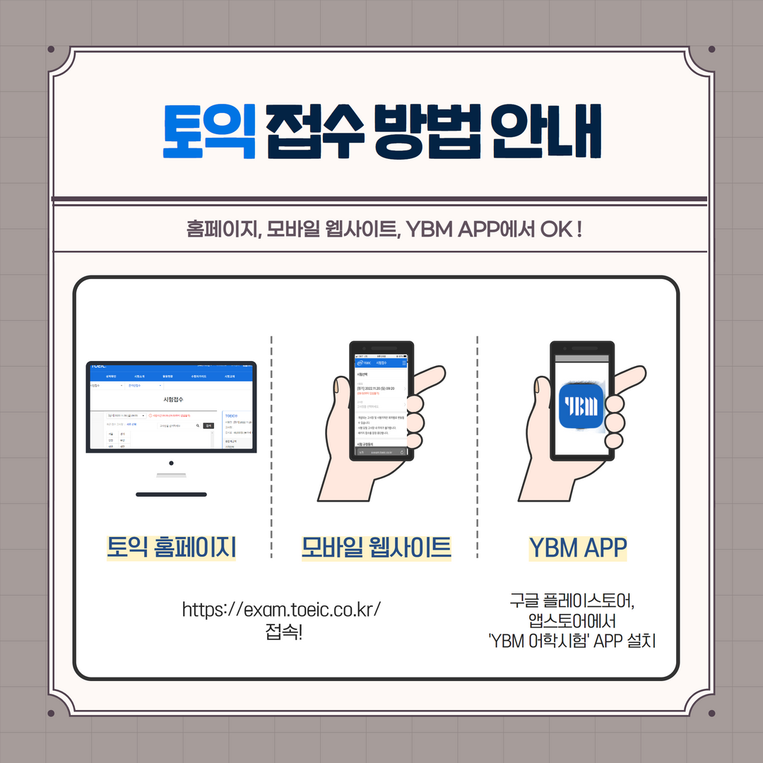앞서 말씀드린 대로, 토익 시험은 토익 홈페이지 및 모바일 웹사이트, YBM 어학시험 APP에서 접수하실 수 있습니다. YBM 어학시험 APP을 설치하시면 어학시험과 관련한 다양한 정보와 시험 일정 등을 더 손쉽게 확인하실 수 있다는 사실!