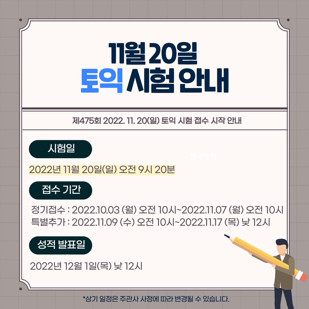 2022년 11월 20일(일) 제 475회 토익 시험 접수가 시작됐습니다! YBM 한국TOEIC위원회는 수험자 여러분의 편의를 위해 11월 토익 시험을 한 회차 더 추가했습니다. <토익스토리>에서도 이 소식을 따끈따끈하게 전해드린 바 있는데요. 이로써 2022년 남아있는 토익 시험은 단 7번이 되었습니다.