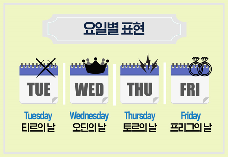 우리가 자주 사용하는 각 요일을 의미하는 영어 표현 중 화, 수, 목, 금요일은 북유럽 신화에 등장하는 신들의 이름을 따서 만들어졌답니다. 먼저 화요일인 ‘Tuesday’는 전쟁의 신 티르의 이름에서 유래된 말입니다. 티르는 전쟁의 신답게 두려움을 모르고 신들 중 가장 용감하다고 알려져 있습니다. 칼의 수호신이기도 하죠. ‘Tuesday’는 이런 전쟁의 신 티르의 날을 의미하는 ‘Tiw’s day’가 변해 만들어진 말이랍니다.