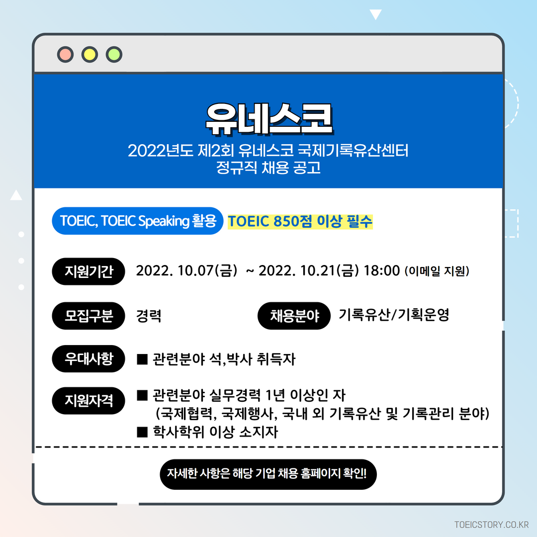 | 유네스코 | 경력 | 2022년도 제2회 유네스코 국제기록유산센터 정규직 채용 공고 | 10.21(금) 18:00 | TOEIC 850점 이상 필수 |