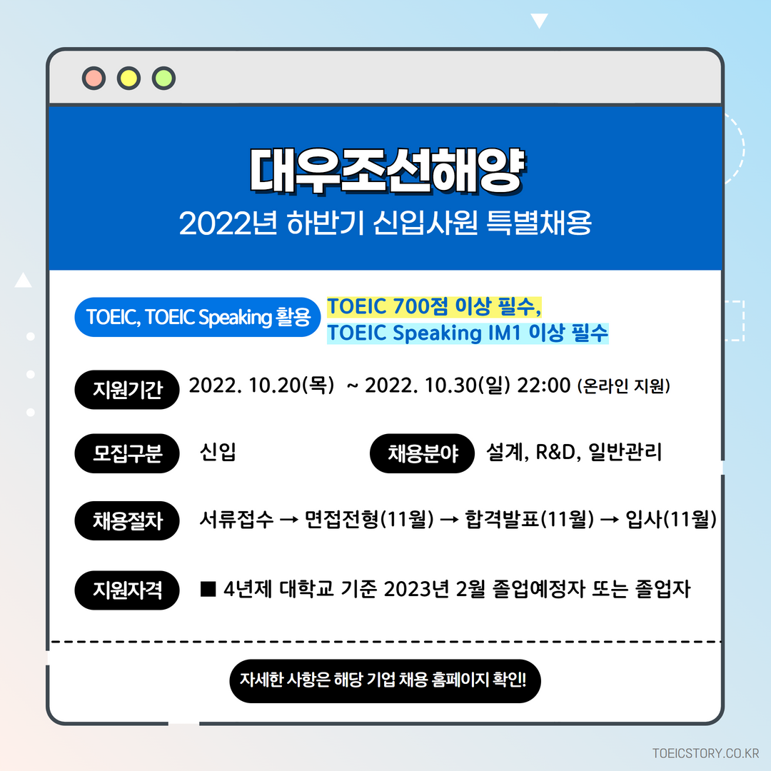 | 대우조선해양 | 신입 | 2022년 하반기 신입사원 특별채용 | 10.30(일) 22:00 | TOEIC 700점 이상 필수, TOEIC Speaking IM1 이상 필수 |