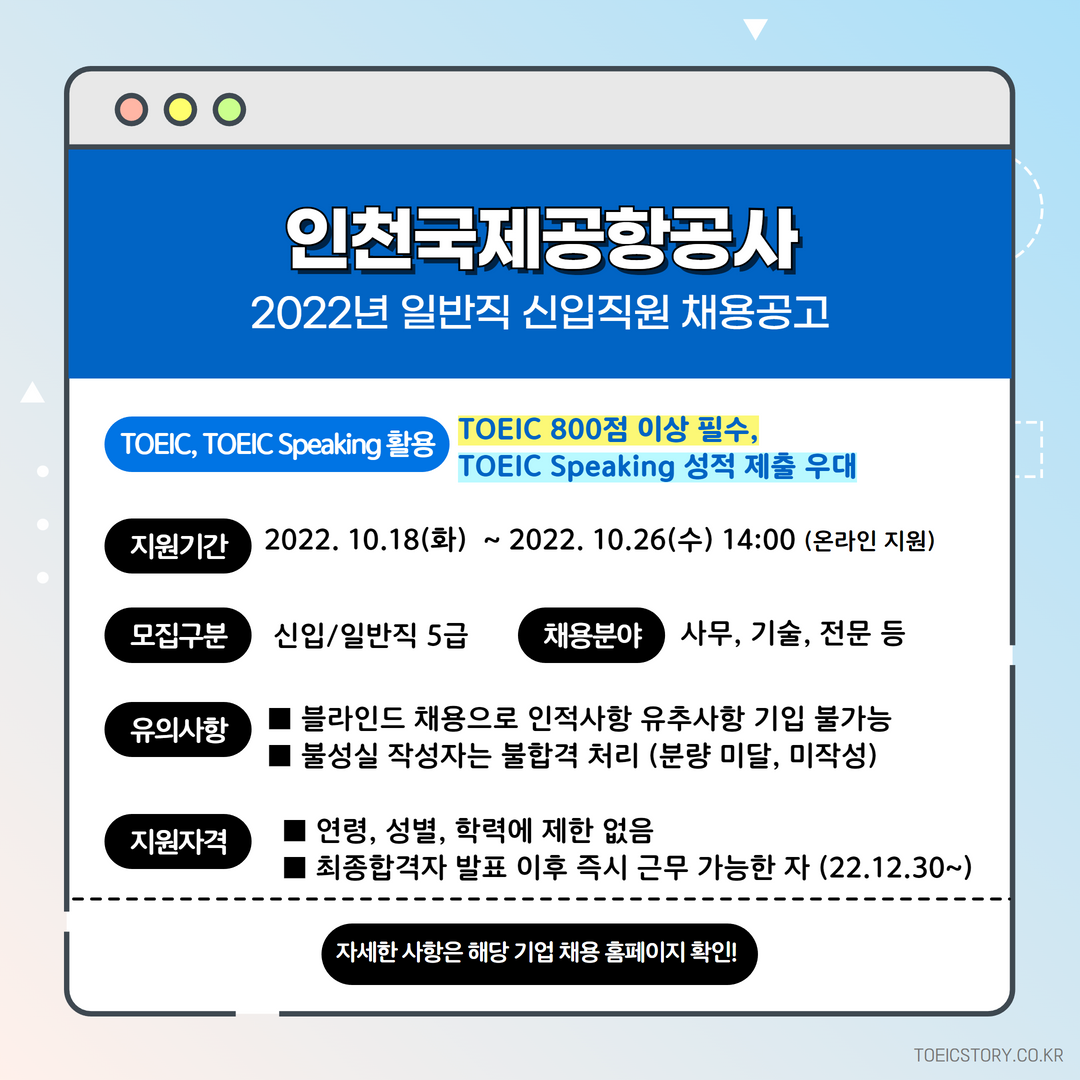 | 인천국제공항공사 | 신입 | 2022년 일반직 신입직원 채용 공고 | 10.26(수) 14:00 | TOEIC 800점 이상 필수, TOEIC Speaking 성적 제출 우대 |