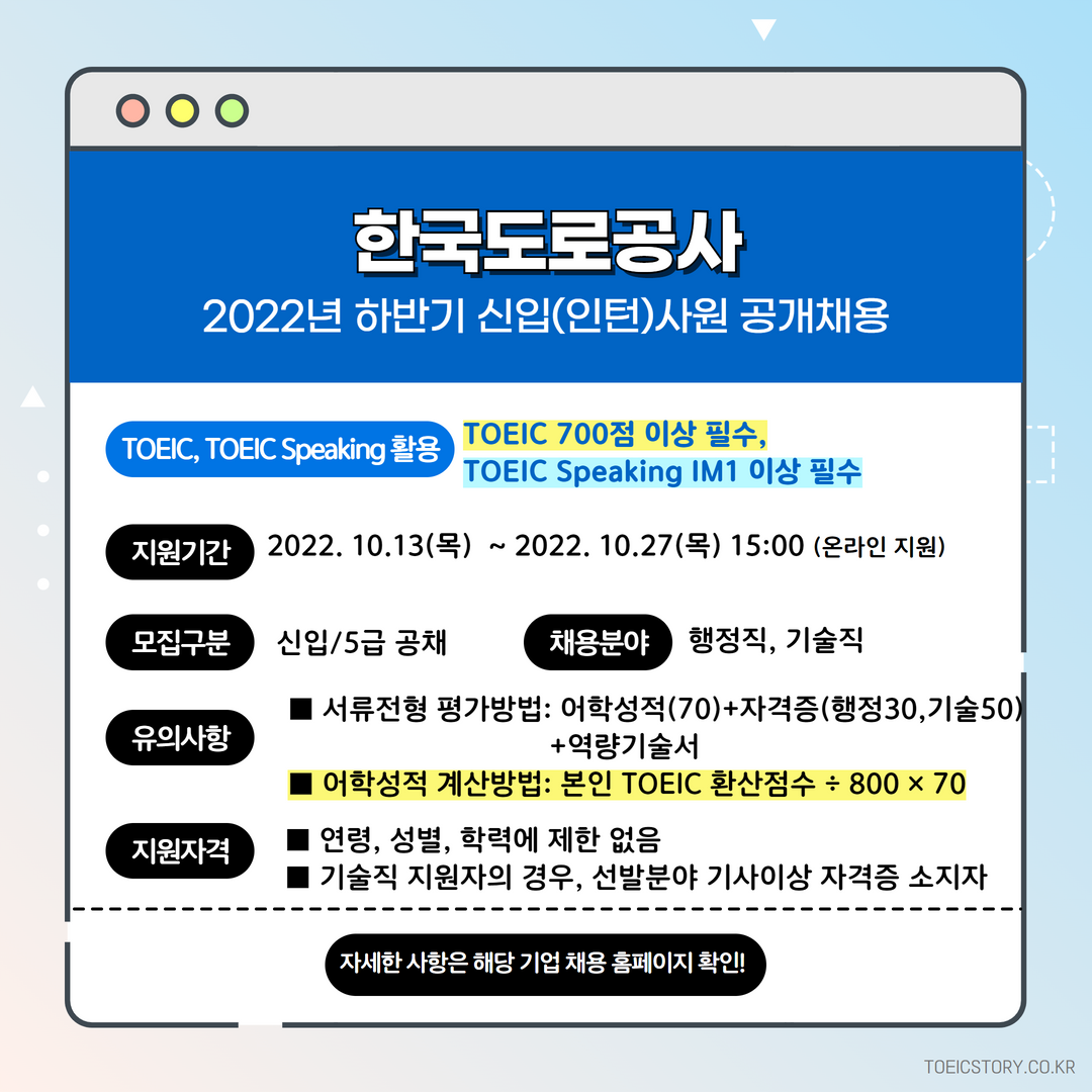 | 한국도로공사 | 인턴 | 2022년 하반기 신입(인턴)사원 공개채용 | 10.27(목) 15:00 | TOEIC 700점 이상 필수, TOEIC Speaking IM1 이상 필수 |