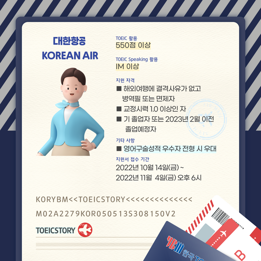 대한항공은 3년 만에 기내 안전, 서비스 업무를 수행할 객실승무원을 모집합니다. 지원에 필요한 토익 점수는 550점 이상, 토익스피킹 성적은 IM 이상입니다. 또한 영어구술성적 우수자를 전형 시 우대한다고 하니, 토익스피킹 성적이 고득점일수록 합격에 유리하다는 사실 :)