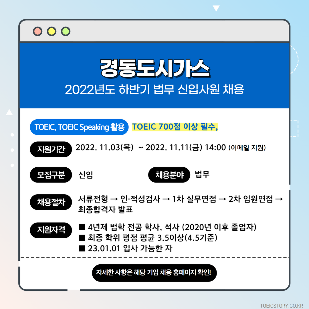 | 경동도시가스 | 신입 | 2022년도 하반기 법무 신입사원 채용 | 11.11(금) 14:00 | TOEIC 700점 이상 필수 |