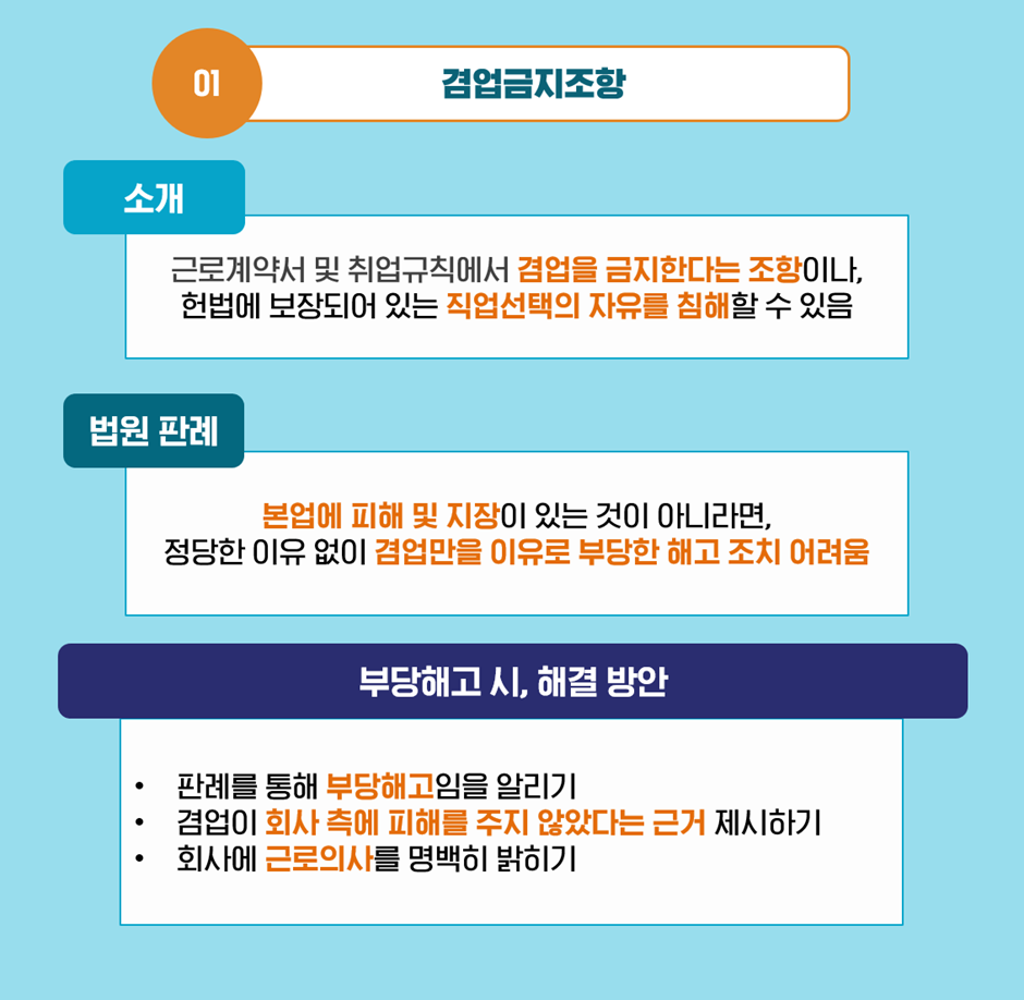 겸업을 할 때 우려되는 부분이 있죠. 기존에 다니고 있던 회사에서 겸업 사실을 알게 되면 불이익을 주지 않을까 하는 것인데요. 회사 내에서 따로 겸업을 금지하고 있는 ‘겸업금지조항’이 없다면 크게 걱정하실 필요는 없습니다. 하지만, 계약서 내에 겸업금지조항이 있다면 추후에 문제가 될 수 있으니, 반드시 미리 계약서를 확인해 보시는 게 좋겠죠?