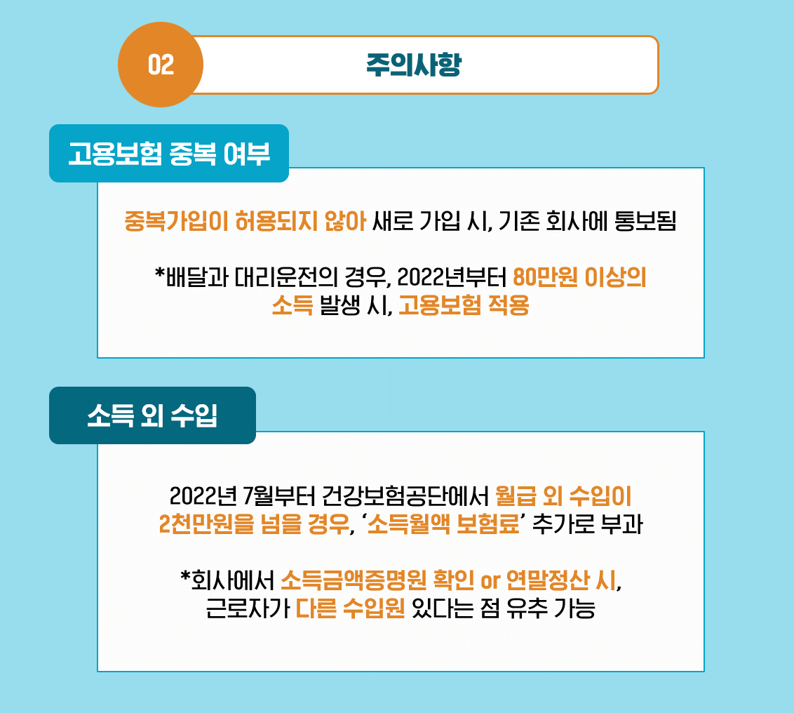 회사에 겸업하고 있다는 사실을 알리고 싶지 않다면, 가장 먼저 고용보험의 중복 여부를 확인해야 합니다. 고용보험은 중복가입이 허용되지 않아, 새로 가입하게 되면 기존 회사에 통보가 되기 때문인데요. 배달과 대리운전의 경우, 2022년부터 80만 원 이상의 소득이 발생하면 고용보험이 적용된다고 하니, 수입을 확인, 조정하는 것도 필요할 것으로 보입니다.