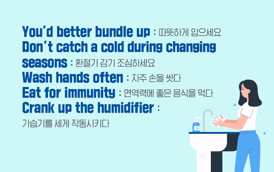 건강을 걱정하는 표현에 대해 알아보았으니, 이제 환절기에 필요한 건강관리 습관을 나타내는 표현에 대해 알아볼까요? 먼저 감기 바이러스의 전파를 막기 위해 가장 중요한 것은 ‘Wash hands often(자주 손을 씻다)’하는 것입니다. 손 씻기는 손을 통해 감염되는 바이러스를 막을 수 있어 아주 기본적이면서도 중요한 습관입니다. 뿐만 아니라 환절기에 떨어지기 쉬운 면역력을 보강하기 위해 ‘Eat for immunity(면역력에 좋은 음식을 먹다)’하는 것도 중요하겠죠? 이 외에도, 쉽게 건조해지는 가을과 겨울철에는 ‘Crank up the humidifier(가습기를 세게 작동시키다)’하여 방안의 습도를 적정하게 유지해 주는 것도 중요하답니다.