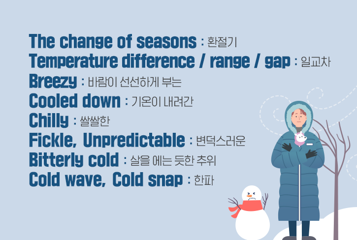 ‘Breezy(바람이 선선하게 부는)’한 가을 날씨에서 한층 ‘Cooled down(기온이 내려간)’한 추운 겨울 날씨까지. 기온과 계절에 걸맞는 날씨를 나타내는 표현도 다양한데요. 환절기에 아침저녁으로 널뛰기하는 온도차를 보고 날씨가 ‘Fickle(변덕스러운)’ 혹은 ‘Unpredictable(예측할 수 없는)’하다고 표현할 수 있습니다. 환절기를 지나 완연한 겨울이 되면 몸을 으슬으슬하게 떨게 되는 ‘Chilly(쌀쌀한)’한 날씨에 나아가, 롱패딩을 입지 않고는 버틸 수 없는 ‘Bitterly cold(살을 에는 듯한 추위)’를 경험하게 되기도 하죠. 올해 ‘Cold wave(한파)’도 조만간 찾아올 텐데요. 이런 한파가 갑자기, 일시적으로 찾아올 경우엔 ‘Cold snap(일시적 한파)’이라고 표현하면 된답니다.