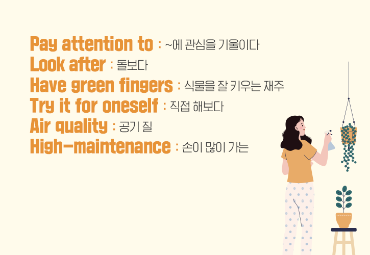 이렇게 키우고 싶은 ‘Pet plant’를 찾아 집으로 데려왔다면, 제일 중요한 것은 식물을 잘 ‘Look after(돌보다)’하는 일이겠죠? 항상 ‘Pay attention to(~에 관심을 기울이다)’하지 않으면, 식물도 생명인 만큼 쉽게 시들고 상할 수 있습니다. 생각보다 식물은 ‘High-maintenance(손이 많이 가는)’한 존재이거든요. 물을 주는 빈도에서부터 정기적인 화분 갈이, 함께 키우는 식물이나 일조량, ‘Air quality (공기 질)’까지 세심하게 신경 쓸 필요가 있습니다.