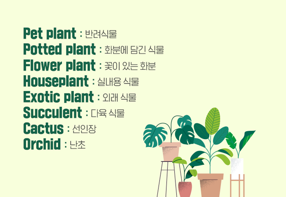처음 ‘Pet plant(반려식물)’를 키우기로 결심했다면 이곳을 방문해 보시면 좋습니다. 바로 ‘원예 시장’인데요. 다양한 종류의 식물들을 만나볼 수 있고, 각종 식물들을 키우는 방법부터 나의 거주 환경에 맞춰 키우기 좋은 식물들을 알려주기도 하니, 큰 도움이 되겠죠? 사무실이나 집에서 책상에 두고 키우기 좋은 작은 ‘Potted plant(화분에 담긴 식물)’나, 화사하게 방 분위기를 밝혀주는 ‘Flower plant(꽃이 있는 화분)’를 길러보는 것도 좋겠습니다. ‘Houseplant(실내용 식물)’에는 정말 다양한 종류가 있으니, 취향에 맞게 골라보면 좋겠네요! :)