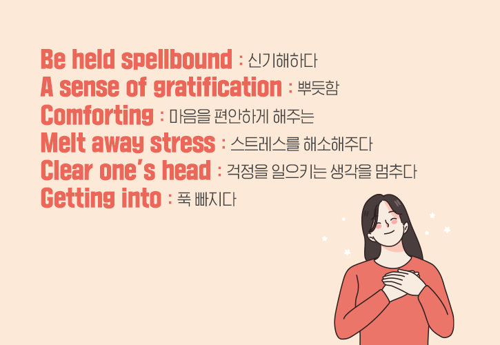애지중지 키워낸 식물이 하루가 다르게 쑥쑥 자라나는 모습을 보면 ‘Be held spellbound’하는 감정을 느끼곤 하죠. ‘Be held spellbound’는 ‘신기해서 넋을 잃고 바라보게 된다’는 의미로 자주 사용되는 표현입니다. “I was held spellbound when I saw my plant bore fruit. (나는 내 식물이 열매를 맺었을 때 신기해서 넋을 잃고 바라보았다.)”와 같이 사용해 볼 수 있답니다. 이렇게 식물이 자라는 모습을 보면 이 식물을 키워낸 바람과 햇살 등 자연환경에 ‘A sense of gratification(뿌듯함)’을 느끼게 되는 것도 식물 키우기의 장점입니다. :)