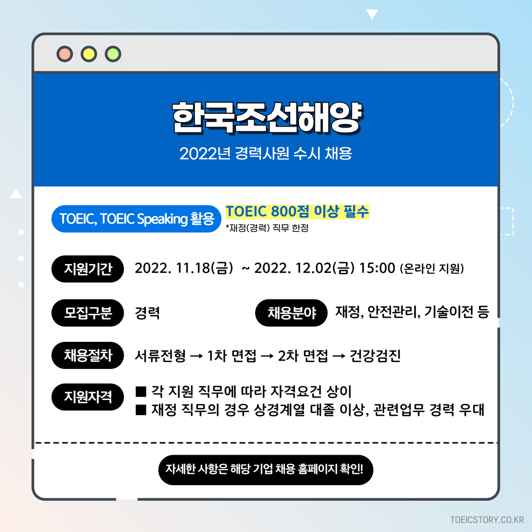 <토익스토리>가 한국조선해양, 한국통계진흥원, 우리금융캐피탈 채용 정보를 안내해 드립니다. 모집 마감일과 토익, 토익스피킹 성적 기준을 확인해 보세요!