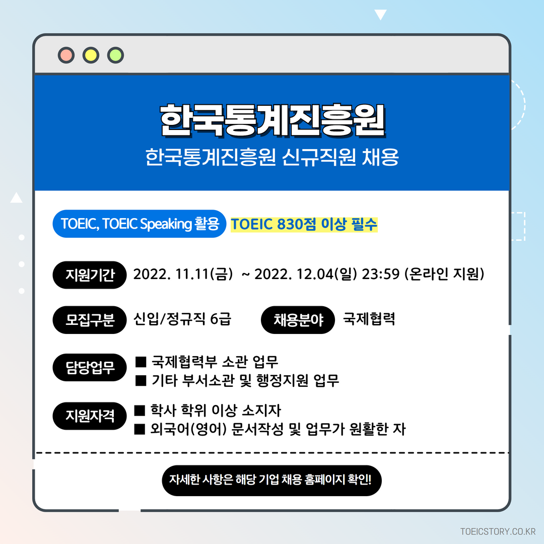 한국통계진흥원 신입 한국통계진흥원 신규직원 채용 12.4(일) 23:59 TOEIC 830점 이상 필수
