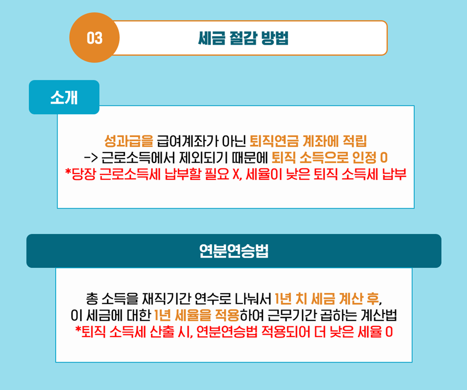 퇴직연금 계좌에 적립하게 될 경우 세금 절감이 되는 이유는 성과급을 퇴직 소득으로 인정받기 때문인데요. 일반적으로 퇴직 소득은 다른 소득보다 세금이 낮습니다. 때문에 퇴직 시 비교적 세율이 낮은 퇴직 소득세로 납부할 수 있게 되죠! 하지만 퇴직연금 계좌에 적립할 경우, 당장 성과급을 운용하지 못하기 때문에 나에게 더 필요한 방법이 무엇인지 잘 따져보아야겠죠? :)