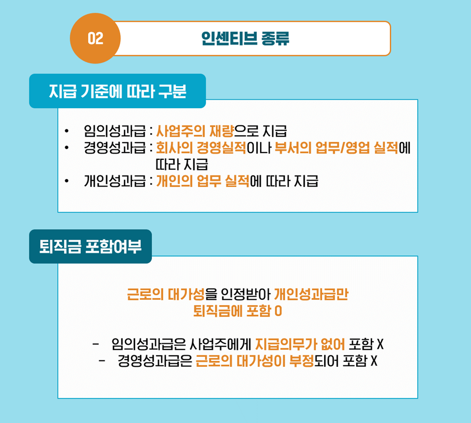 인센티브는 지급 기준에 따라 크게 3가지로 구분할 수 있는데요. 사업주의 재량으로 지급하는 ‘임의성과급’, 회사의 경영실적이나 부서의 업무/영업 실적에 따라 지급하는 ‘경영성과급’과 개인의 업무 실적에 따라 지급하는 ‘개인성과급’입니다.